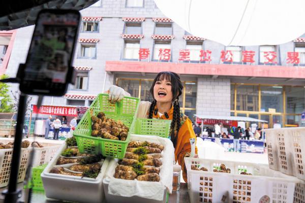 A live-streamer selling matsutake calls out to the Shangri-La matsutake market, Yunnan province, on July 24. GAO YONGWEI/XINHUA