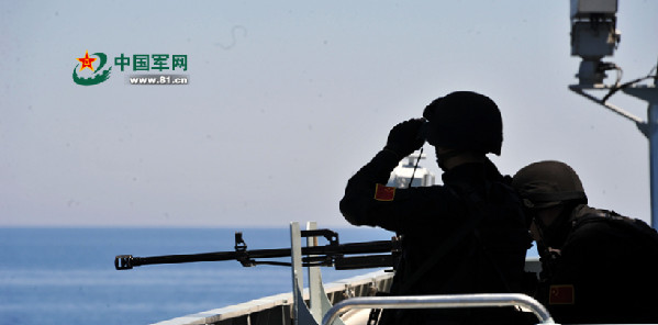Members of the Chinese naval special force keep close watch on the sea surface in the anti-frogmen operation. During the "Naval Interaction - 2015" China-Russia joint maritime exercise, 9 Chinese and Russian warships held a maritime defense drill in an area of Mediterranean Sea on May 18, 2015. (Photo: Chinamil.com.cn/Zheng Wenda)