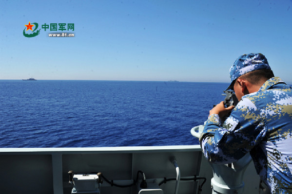 A soldier aboard the Chinese naval frigate Linyi observes the sea and air situations during the joint defense drill. During the "Naval Interaction - 2015" China-Russia joint maritime exercise, 9 Chinese and Russian warships held a maritime defense drill in an area of Mediterranean Sea on May 18, 2015. (Photo: Chinamil.com.cn/Zheng Wenda)