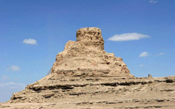 The city pagoda and a single three roomed house are regarded as the landmarks of Loulan's ruins. Only four walls of the house still stand, and the pagoda is seriously weathered, reduced to a cylindrical mound.