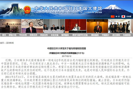 The Chinese Embassy in Japan on Sunday issued an alert to its nationals who have plans to travel in Japan, reminding them of the high-level radiation inside a damaged reactor of the Fukushima Daiichi nuclear plant.