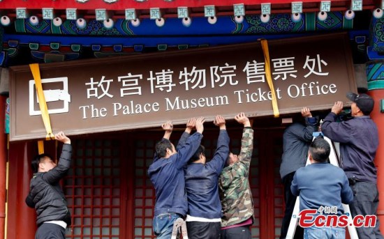 Staff members of the Palace Museum remove the ticket office sign in Beijing, Oct. 10, 2017, as all ticket sales go online. The Palace Museum sets a daily visitor cap of 80,000 and set a record by selling all tickets online in about 90 minutes on Oct. 2. It will celebrate the 92nd anniversary of its founding. (Photo: China News Service/Du Yang)