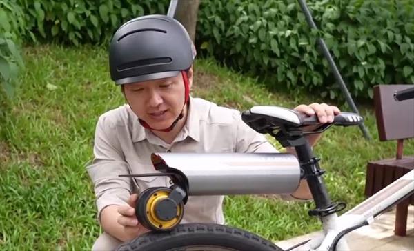 A cyclist adjusts a clip-on motor of a bike. (Photo/CMG)