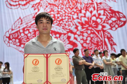 The world’s largest paper-cut work “Longevity” was on display at Hunan Arts and Crafts Vocational College from June 29, 2011 to July 4. The work by Zhu Haipeng, student of the college, is 21 meters high and 315 square meters in size. [CNS Photo/ Huang Yaohui]