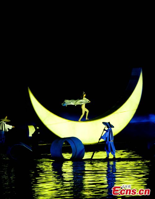 The full-length open-air show, Impression of Liu Sanjie was recently performed along Lijiang River in Guilin, south China¨s Guangxi Zhuang Autonomous Region. The file photo was taken in the show on the evening of July 1, 2011. [CNS Photo/ Wang Zhongju]