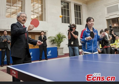The Chinese table tennis delegation, gathering three generations of athletes, arrived in San Francisco, on local time July 5, 2011, in celebration of the 40th Anniversary of Sino-US Ping Pong diplomacy. San Francisco Mayor Edwin M. Lee played table tennis with Cai Zhenhua, leader of the delegation, and Chinese famous athlete Liang Geliang. Mr. Lee announced July 5 to be San Francisco¨s Ping Pong Diplomacy Day. [CNS Photo/ Chen Gang]