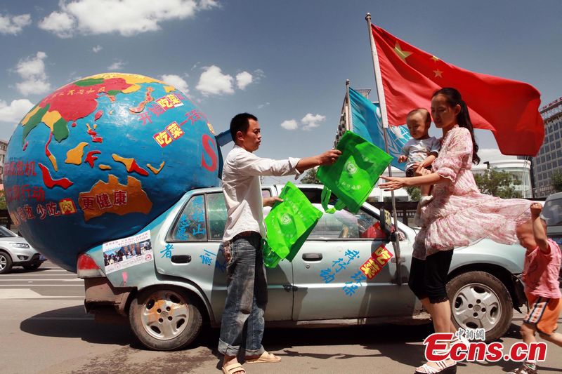 A man driving a refitted vehicle with an Earth model promoted environmental protection in Taiyuan, north China's Shanxi Province, on July 7, 2011. Jiang Guishan shut down his profitable restaurant and became a conservation advocate in 2007. During the past four years, he has travelled through numerous cities across the nation to spread environment ideas. [CNS Photo/ Wei Liang]