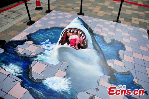 A 50m X 5m 3D painting brought the residents around Fuzhou Taijiang Wanda Plaza to real scene on July 17. [CNS Photo/Zhang Bin]