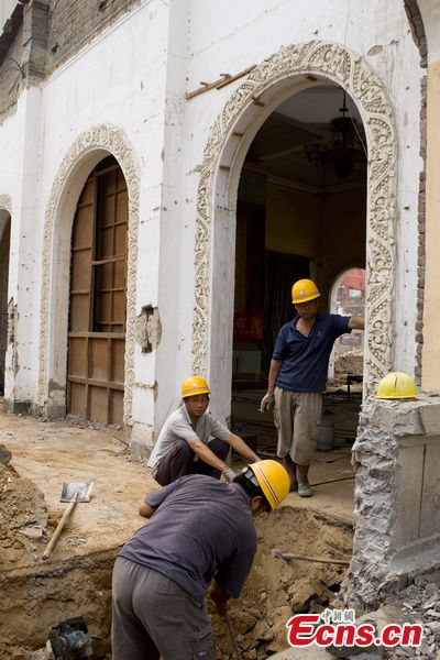 Workers dig trenches for a horizontal move of the main exhibition hall of the Yellow River Museum in Zhengzhou, capital of central China's Henan Province, July 19, 2011. Two wings of the museum had already been demolished, to be rebuilt later. For the construction of subway line 1 and 2, local authorities allowed a move of the world's first museum devoted to water conservancy. [CNS Photo/ Wang Zhongju]