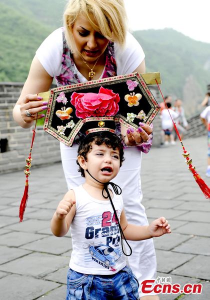 Overseas tourists in Chinese traditional costumes have pictures taken on the Juyongguan Great Wall in Beijing, July 20, 2011. [CNS Photo/Lu Xin]