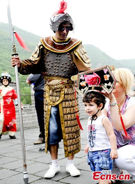 Overseas tourists in Chinese traditional costumes have pictures taken on the Juyongguan Great Wall in Beijing, July 20, 2011. [CNS Photo/Lu Xin]
