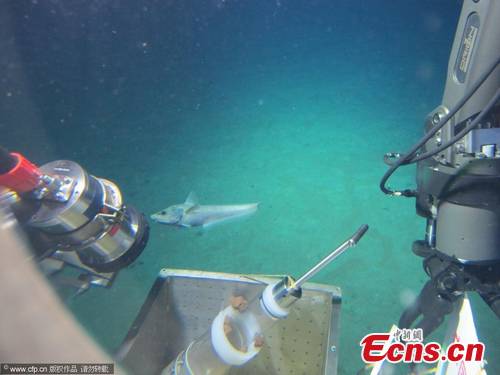 On the morning of July 26, deep-sea Chinese submersible, the Jiaolong, reached a depth of 5,057 meters in its second test dive, setting a new record of Chinese manned deep dive. [CFP Photo]