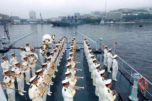 A fleet formed by China's naval Zhenghe training ship and Luoyang missile frigate arrived in Vladivostok, Russia, for a four-day visit, July 29, 2011. [Xinhua Photo]