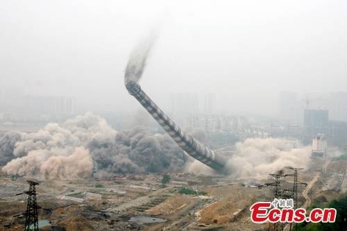 A heavily polluting chimney in Jialing Power Plant in downtown Chengdu, the tallest one of its kind, was blasted down on August 10, 2011. [CNS Photo/Zhang Lang]