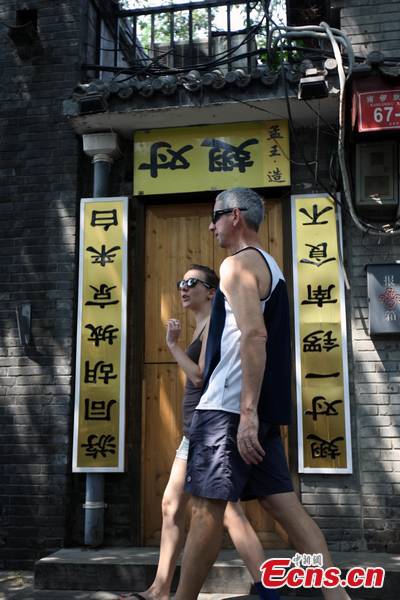 Two tourists pass by a little restaurant featuring grilled chicken wings in Nanluoguxiang, a historical area in Beijing, on the morning of August 11. An antithetical couplet is hanging at the gate, meaning this restaurant is a must to experience the Hutong culture in Beijing. Interestingly, all the Chinese characters are written upside down. (CNS photo/Zhao Hao)