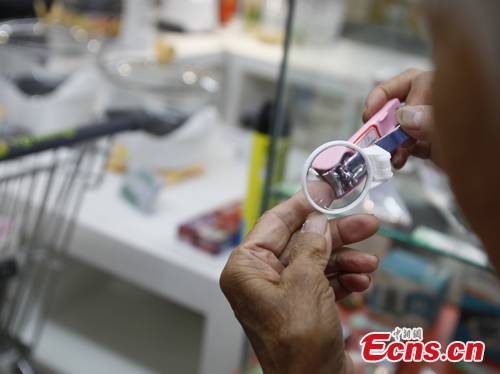 An elderly shopper tries a nail clipper with a magnifier at the first product section specially for the elderly in a Beijing's supermarket, August 23. [CNS Photo/SU Dan]