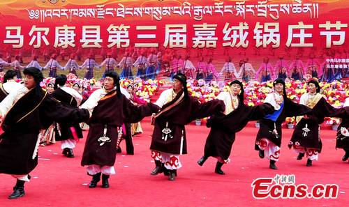 Jiarong Tibetan dance at the 3rd Jiarong Guozhuang (Tibetan bonfire dance, which means "singing and dancing in a circle") Festival in Aba Tibetan and Qiang Autonomous Prefecture, southwest China's Sichuan Province, August 25. As a unique folk dance among Jiarong Tibetan, it can be traced back to over a thousand years ago. [CNS Photo/An Yuan]