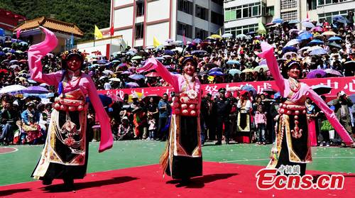 Jiarong Tibetan dance at the 3rd Jiarong Guozhuang (Tibetan bonfire dance, which means "singing and dancing in a circle") Festival in Aba Tibetan and Qiang Autonomous Prefecture, southwest China's Sichuan Province, August 25. As a unique folk dance among Jiarong Tibetan, it can be traced back to over a thousand years ago. [CNS Photo/An Yuan]