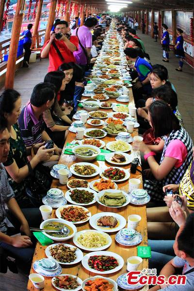 People of Dong ethnic group treat tourists to a "gathering feast" at an over 200-meter-long table in south China's Hunan Province, September 13. [CNS Photo/Yang Huafeng]