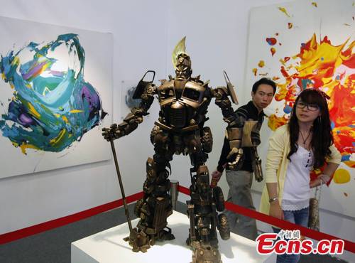 A "Guan Gong" (a courageous warrior in Chinese history) Optimus Prime is on display during the Beijing International Design Week, September 25, 2011. [CNS Photo/Zhang Hao]
