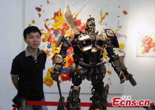 A "Guan Gong" (a courageous warrior in Chinese history) Optimus Prime is on display during the Beijing International Design Week, September 25, 2011. [CNS Photo/Zhang Hao]