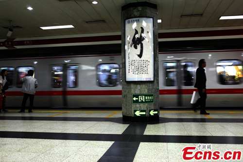 Calligraphy works featuring Chinese characters of plum blossom, orchid, bamboo and chrysanthemum--all symbols of moral integrity in traditional culture!hang in subway stations of Line 1, Monday in Beijing. The Beijing Subway will also issue chrysanthemum-themed tickets tomorrow. [CNS Photo/Zhang Ruichao]