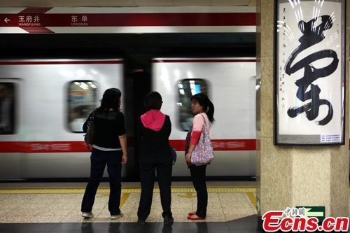 Calligraphy works featuring Chinese characters of plum blossom, orchid, bamboo and chrysanthemum--all symbols of moral integrity in traditional culture!hang in subway stations of Line 1, Monday in Beijing. The Beijing Subway will also issue chrysanthemum-themed tickets tomorrow. [CNS Photo/Zhang Ruichao]