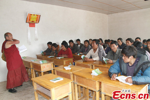 Sang Muzhi, a lama in his 70s in Gannan Tibetan Autonomous Prefecture of Gansu Province, has been dedicated himself to wiping out illiteracy among local residents, which won him respect and love from his students. He started a pilot project in Mairi Village and offers three lectures every month. Every time, he has to tramp over rugged mountain roads to get there. [CNS Photo/Zhang Daozheng]