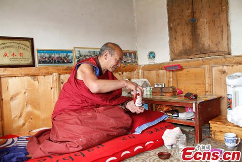 Sang Muzhi, a lama in his 70s in Gannan Tibetan Autonomous Prefecture of Gansu Province, has been dedicated himself to wiping out illiteracy among local residents, which won him respect and love from his students. He started a pilot project in Mairi Village and offers three lectures every month. Every time, he has to tramp over rugged mountain roads to get there. [CNS Photo/Zhang Daozheng]