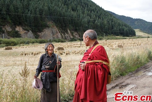 Sang Muzhi, a lama in his 70s in Gannan Tibetan Autonomous Prefecture of Gansu Province, has been dedicated himself to wiping out illiteracy among local residents, which won him respect and love from his students. He started a pilot project in Mairi Village and offers three lectures every month. Every time, he has to tramp over rugged mountain roads to get there. [CNS Photo/Zhang Daozheng]