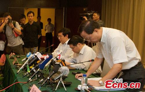 Yu Guangyao, president of Shanghai Shentong Metro Co., Ltd, bows and apologizes for Tuesday's subway train collision at a press conference, September 27. The rear-end accident at line 10 in the city left 271 people injured. [CNS Photo/Chen Zhongqiu]