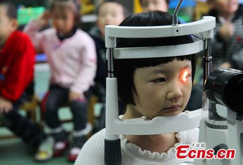 A child takes an eyesight test at her kindergarten, October 12, 2011. Professionals from the local ophthalmology department visited kindergartens in Hefei as the World Sight Day approaches. [CNS Photo/Han Suyuan]