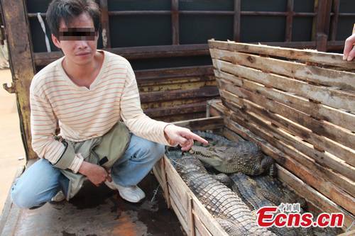 A suspect identifies crocodiles smuggled alive. 501 live crocodiles, a species under state protection, were seized in early October on a county road by Guangxi police. [CSNS Photo/Yan Xunhai]