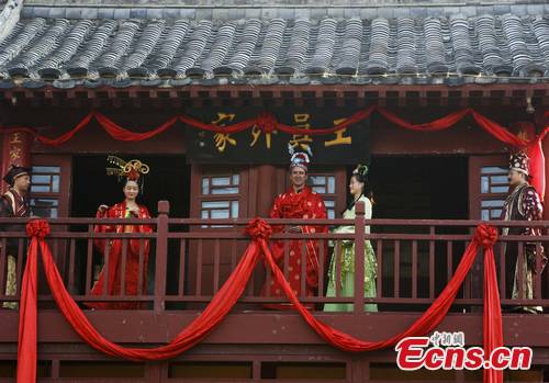 A foreigner was lucky enough to be hit by a red silk ball, thus winning a "bride" at a traditional groom-selecting ceremony as part of tourism promotion during a chrysanthemum show in Kaifeng, Central China's Henan Province, October 17. [CNS Photo/Wang Zhongju]