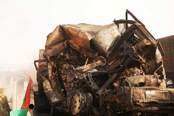 Photo taken on Oct. 21, 2011 shows a destroyed vehicle involved in a pileup of over 20 vehicles on the Baomao Expressway in Luochuan County, northwest China's Shaanxi Province. More than 20 vehicles crashed into each other early Friday on the Baomao Expressway in Luochuan County, leaving at least six people dead and many others injured. (Xinhua/Chen Changqi)