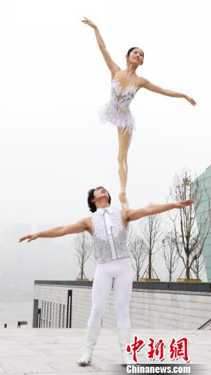 Wei Baohua and Wu Zhengdan, who will perform the leading roles in the acrobatic ballet "Swan Lake" on the evening of November 4, dance by the Jialingjiang River on Tuesday to publicize their upcoming show in Chongqing. [CNS Photo/Hou Wenbin]