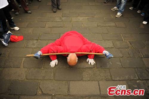 Ren Shanglin, 78, shows off his flexibility before running a marathon, and his unique warm-up receives loud applause, November 5. More than 2,000 runners from 60 countries and regions take part in the Xi'an International Marathon in northwest China's Shaanxi Province. [CNS Photo/Zhang Yuan]