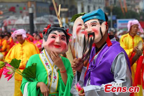 Performers from Lingui County dance during a parade of the International Wetland Folk Culture Exhibition in Guilin, south China's Guangxi Zhuang Autonomous Region, November 7, 2011. [CNS Photo/ Zhou Lishuo]