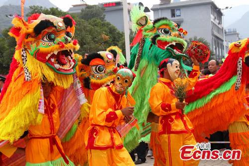 Performers from Lingui County dance during a parade of the International Wetland Folk Culture Exhibition in Guilin, south China's Guangxi Zhuang Autonomous Region, November 7, 2011. [CNS Photo/ Zhou Lishuo]