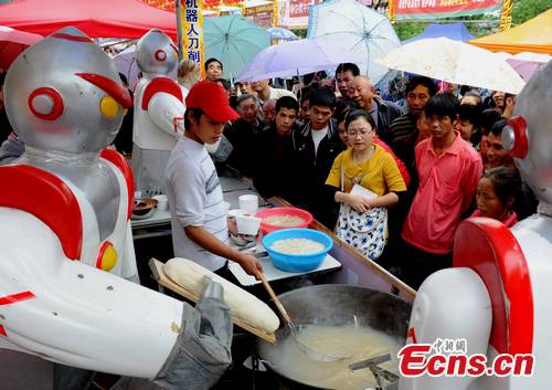 Robots are occupied with slicing noodles at a booth surrounded by a crowd of visitors during the 6th Minxi Chinese Food Festival in Longyan City, east China's Fujian Province, November 8. [CNS Photo/Liu Kegeng]