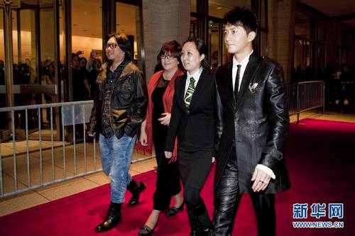 Gao Xiaosong (1st L), a noted Chinese pop musician and the director of "My Kingdom", along with the starring actor Han Geng (1st R) and some of his production crew, attends the opening ceremony of the 2nd New York Chinese Film Festival, November 8 (local time). Gao was released Tuesday morning from jail in Beijing after serving a six-month term for drunk driving. [Xinhua Photo]