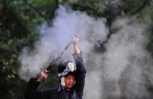 An ethnic Miao group man fires a shot in the village of Basha in Congjiang county, Guizhou province Nov 16, 2011. [Photo/Agencies]