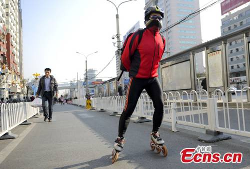 A Beijing office worker goes to work on roller skates, November 28, 2011. [CNS Photo/Liao Pan]