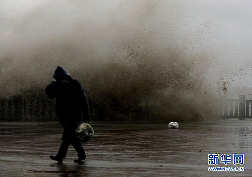A waste picker walks along a bank as huge waves drive against the seashore in Lianyungang, east China's Jiangsu Province, November 30, 2011. Influenced by cold air, a storm surge hits the city, forcing all ships to wait in the harbor. [CNS Photo/Wang Jianming]