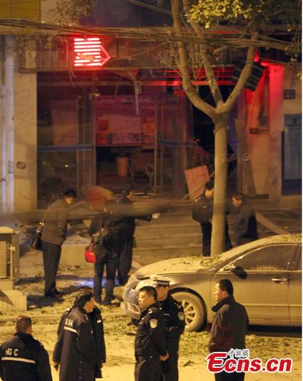 An explosion on the front walk of a branch of China Construction Bank in Wuhan, capital of central China's Hubei Province, killed 2 passersby, December 1, 2011. More than ten victims were hospitalized with injuries. The cause of the blast is under investigation. [CNS Photo/Zhang Chang]