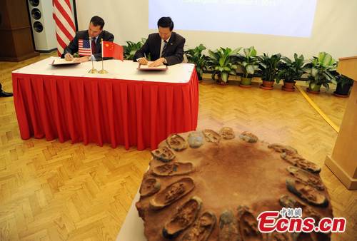 The Chinese Consul General in Los Angeles Qiu Shaofang signs an agreement with the US representative at the Chinese consulate, December 1, under which the US returns 22 dinosaur egg fossils including 19 with embryos. [CNS Photo/Mao Jianjun]