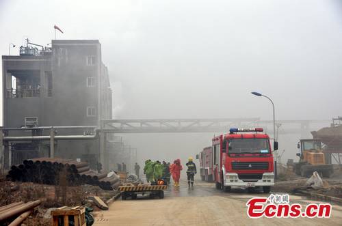 A physical explosion of a steel structural vertical tank, which stores 20 tons sulfuric acid of a 98% consistency, occurs at an industry zone in Hukou County, east China's Jiangxi Province, at around 13:00 p.m., December 5, 2011. The sulfuric leakage was under control at 15:30 p.m.. No casualties are reported. [CNS Photo/Liu Desheng]