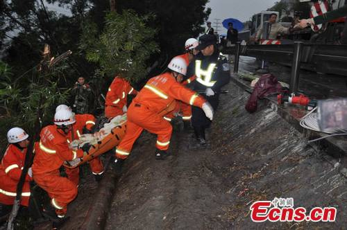 Rescuers rush to the scene of a fatal car accident in Nandan County, south China's Guangxi Zhuang Autonomous Region, December 7, 2011. A coach fell over a deep ravine after it scratched a truck, leaving six people killed and a dozen others injured. [CNS Photo/Wang Shuang/Huang Jiacheng]