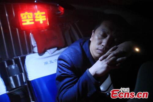 A taxi driver falls asleep in his waiting outside a natural gas station in Taiyuan, capital of north China's Shanxi Province, on the early morning of December 14, 2011.