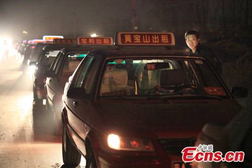 A long line of cabs forms outside a gas station in Taiyuan, capital of north China's Shanxi Province, on the early morning of December 14, 2011. Gas shortage, the rising number of oil-turned-gas cars as a result of high oil prices and a small number of gas stations in many cities all contributed to the long queues in Xi'an, Lanzhou, Haikou and other cities. [CNS Photo/Wei Liang]